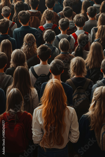 large, group, children, standing, crowd, people, student, backpack, school, education, youth, gathering, event, audience, spectator, indoor, photo, circle, facing, away, camera, different, age, all, wearing, sharpened, back, young, girl, long, red, hair, center, looking, toward, taken, high, angle, body, visible, background, blurred, room, ceiling, window, left, side, mood