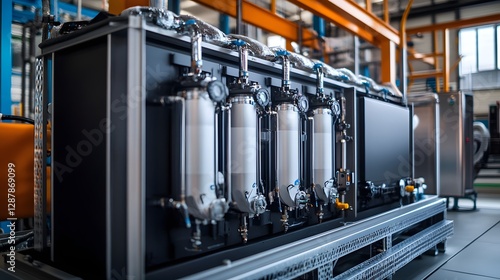 A large industrial machine with four tanks on it. The tanks are white and the machine is black