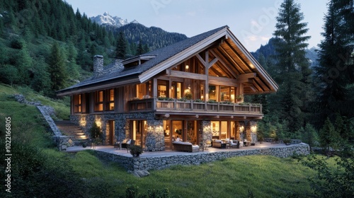 A large, luxurious wooden chalet with stone details, warmly lit in the evening, nestled in a peaceful mountain setting surrounded by nature.