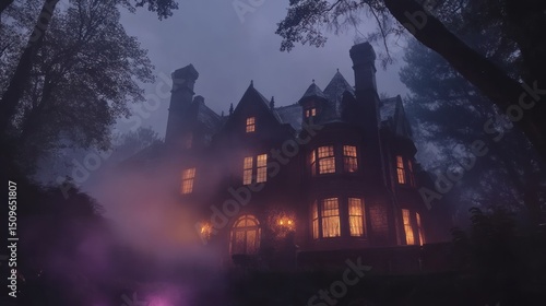 house, luxury home, gothic, skittish, fog, smoke, tree, forest, dark, night, window, light, glowing, eerie, ominous, mysterious, architecture, building, facades, chimney, roof, gable, ornate, old, vintage, exterior, pathway, landscape, branch, twilight, silhouette, shadow, mist, purple, orange, atmosphere, environment, creepy, haunting, unnatural, secluded, stillness, quiet, dramatic, grand, detailed, historical
