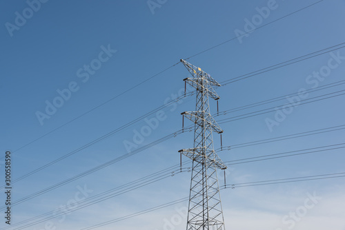cloudless, grid, sky, large, electricity, powerline, industrial, tower, transmission, volt, voltage, industry, infrastructure, consumption, danger, electric, electrical, energy, background, line, metal, pillar, pole, power, amper, supply, watt, wire, sunny day, closeup, urban, outdoors, towering, blue, cable, steel, high, pylon, line, space