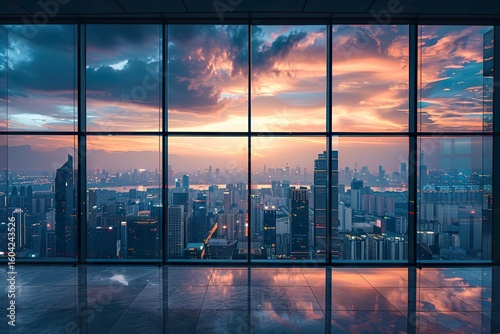 A large modern window frame with sleek black metal and oversized panes of clear glass, offering a panoramic view of a city skyline -