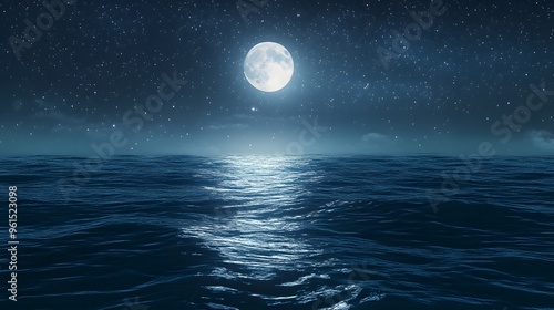 A large moon is reflected in the calm ocean waters. The scene is serene and peaceful, with the moonlight casting a soft glow on the water