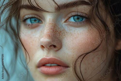 large, portrait, image, girl, blue, eye, freckle, camera, focused, face, natural, beauty, skin, texture, expressiveness, gaze, soft, strand, hair, lightly, touch, creating, feeling, lightness, naturalness, colours, palette, cool, tone, depth, contrast, between, atmosphere, fragility, tenderness, lip, look, close, purity, smooth, mystery, aesthetic, realism, photo