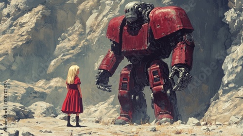A large red robot and a young girl share a moment of interaction, with a cliff in the background.