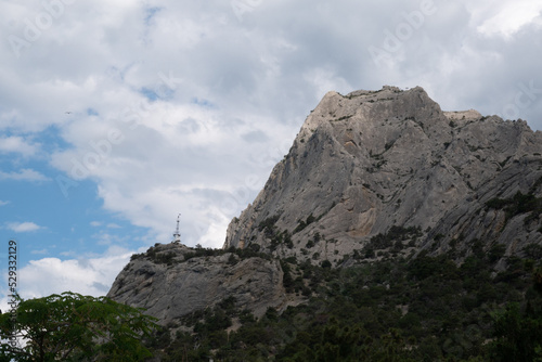 A large rocky mountain against a cloudy sky.