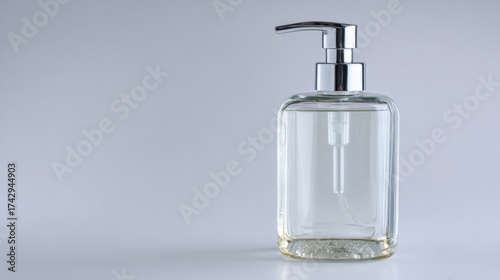 its, soap, bottle, large, transparent, pump, dispenser, side, filled, central, sharpened, shiny, surface, reflect, light, giving, elegant, modern, appearance, stand, alone, neutral, background, highlighting, design, simplicity, presentation