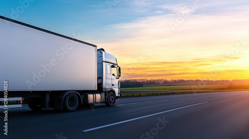 A large truck travels along a highway during sunset, casting long shadows. The vibrant sky transitions from orange to blue, while fields stretch out on either side