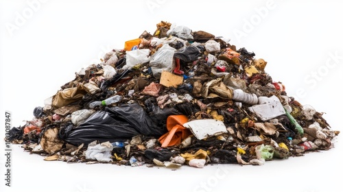 A large unsorted pile of garbage consisting of various waste materials on a plain white background