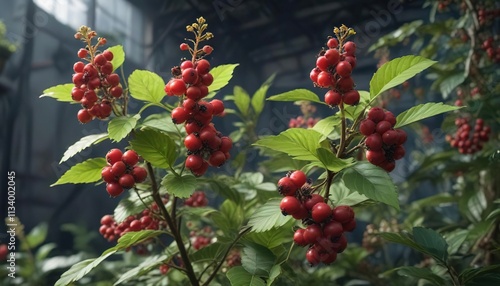 A large waxy berry bearing plant in full bloom, waxy berries, evergreen
