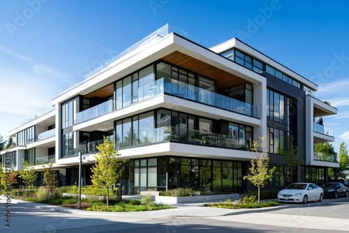 large, white, building, black, trim, glasses, facades, architecture, modern, design, tree, exterior, housing, property, new, urban, apartment, residential, city, contemporary, real, estate, home, luxury, sky, window, construction, balcony, structure, residence, blue, street, development, town, neighbourhood, view, complex, condo, block, brick, nobody, europa, wall, office, flat, business, condominium, row house