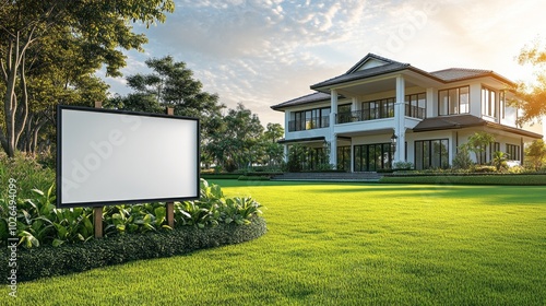 large, white, house, signs, front, blank, lush, lawn, billboard, green, empty, advertise, space, commercial, background, poster, banner, information, board, message, business, marketing, grass, advertisement, mock, nobody, up, park, street, media, city, promotion, template, announcement, tree, urban, display, design, panel, field, summer, frame, landscape, signs, advert, copy space, building