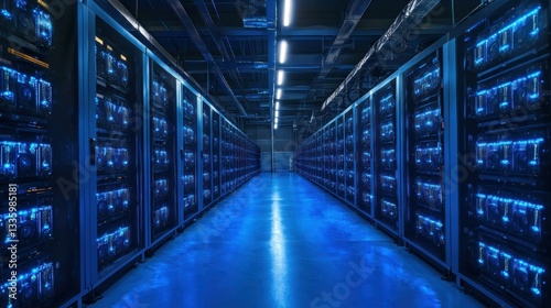 "A large-scale crypto mining farm with rows of GPU rigs glowing in blue LED lights