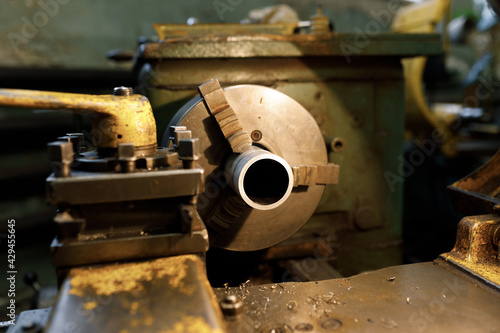 A lathe with a blank in the spindle. Old equipment at the factory from the mid-20th century.