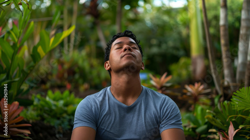 latin, american, man, practicing, deep, breathing, exercise, lush, garden
