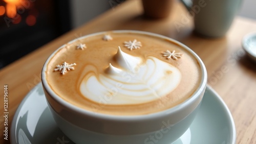 latte art, winter, hot drink, snowflake, mountain chain, cosy, cafes, serene, peaceful, holiday, texture, contrast, soft light, intricate, landscape, snow, nature, scenic, craftsmanship