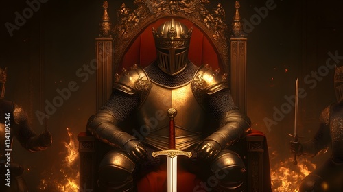 A legendary warrior king sitting on a grand throne, his sword resting at his side.