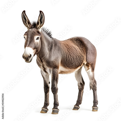 A lifelike portrait of a sturdy donkey standing in side view, isolated on a white background. Detailed grey and brown coat, large expressive ears, and gentle, intelligent eyes. High-resolution, sharp