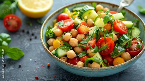 A light and healthy chickpea salad with cherry tomatoes, cucumbers, and a lemon tahini dressing