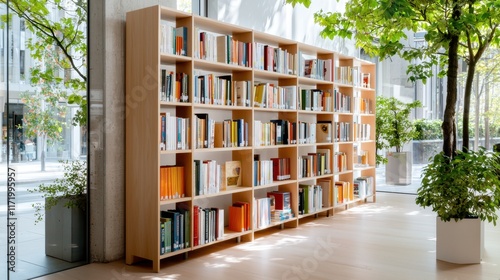 A light colored bookshelf stretches across the background, filled with a variety of books of different sizes and colors