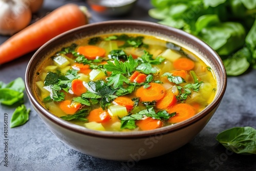 A light vegetable soup in a bowl, filled with carrots, celery, and spinach, garnished with fresh herbs