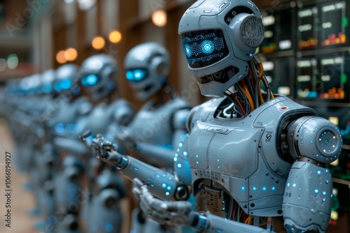 A line of advanced humanoid robots displaying intricate designs in a modern technology exhibition during the daytime