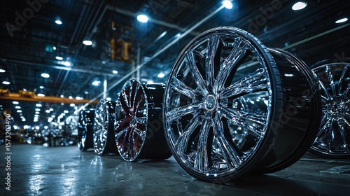 rim, wheel, car, automotive, vehicle, shiny, polished, chrome, steel, metal, transportation, industry, warehouse, factory, production, manufacturing, storage, equipment, part, accessory, design, style, custom, modern, luxury, automobile, performance, transport, mechanic, engineering, technology, repair, upgrade, tuning, detail, closeup, interior, facility, industrial, assembly, new, clean, maintenance, metallic, spin