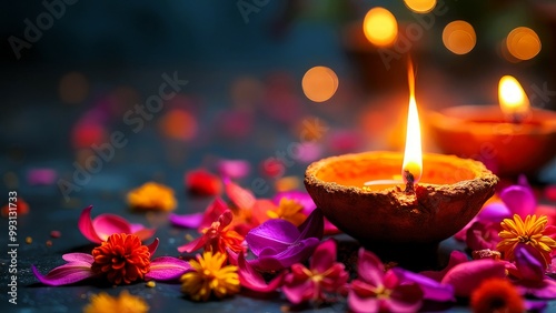 A lit diya candle glowing warmly, surrounded by vibrant flowers and colorful petals, symbolizing the triumph of light over darkness. Soft bokeh background, banner layout with copy space