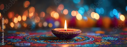 A lit diya rests on a colorful rangoli pattern, with a bokeh background of lights