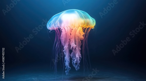 A lit jellyfish glows with a spectrum of rainbow hues and delicate strands, illuminating the ocean depths, showcasing the beauty and intricacy of marine life.