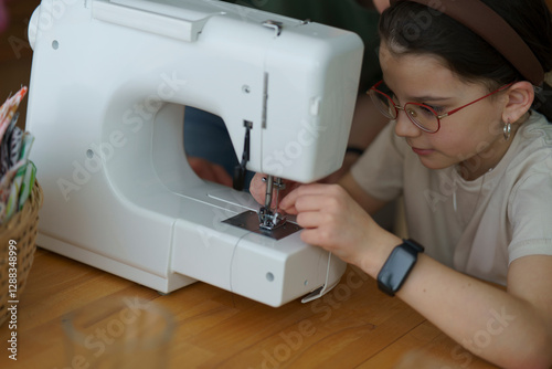A little cute girl wearing glasses sitting at a sewing machine at a wooden table in a room. Educational and creative children's concept.