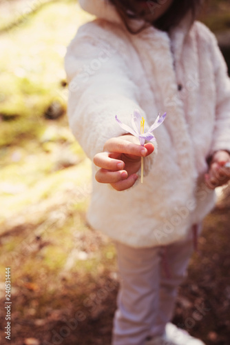 A little girl giving flower crocus. A kid in the mountain. Pine forest with wildflowers