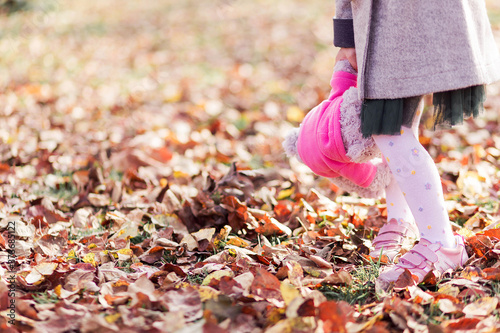 A little girl in a coat, white tights and with a teddy bear in her hands is walking in the autumn park. Legs close up