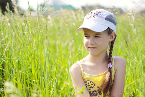 summer, grass, children, field, nature, hat, smile, childhood, fun, green, beauty, spring, face, smiling, outdoors, people, happiness, park, girl, braid, portrait, joy, small, beautiful, cute, alone, meadow, sun, background