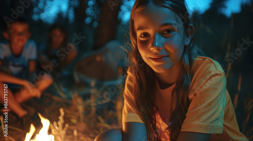 A little girl sitting by a campfire with friends in the forest at a children's camp
