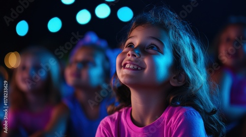 girl, children, happy, joyful, smile, cute, adorable, children, children, light, night, dark, blue, purple, pink, magic, wonder, awe, entertainment, show, performance, event, festival, audience, crowd, young, toddler, pretty, sweet, innocent, expression, face, eye, hair, bright, glowing, dreamy, captivated