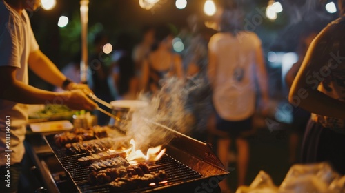 dusk, skewer, warm, festive, evening, social, cosy, smoke, cooking, celebration, party, fun, delicious, vibrant, friendly, atmosphere, cheerful, gathering, food, illuminated, warm tones, inviting, energetic, bustling, community, night, lively, casual attire, enjoyment, relaxed, tasty, glow, culinary, appetising, camaraderie, joy, night scene, comfortable