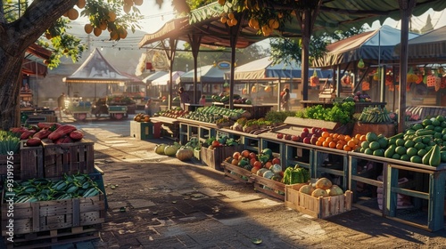A lively farmers market at dawn with fresh produce and morning sunlight, ultra-high-definition textures capturing every detail and realistic lighting
