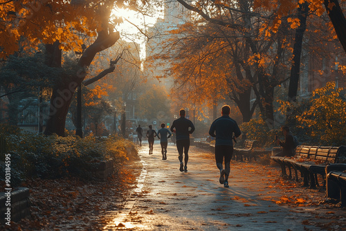 A lively morning jog in a city park, with runners enjoying the fresh air and the natural surroundings, promoting an active and healthy lifestyle.