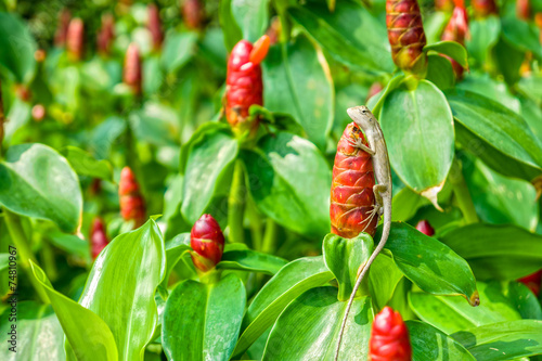 A lizard on Cheilocostus Speciosus flower in public park, Bangko