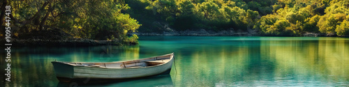 lone, boat, anchor, tranquil, water, hidden, cove, lush, vegetation, serene, peaceful, solitude, calm, quiet, nature, isolated, escape, remote, sanctuary, green, secluded, water, still, scenic, retreat, calmness, haven, paradise, untouched, serenity