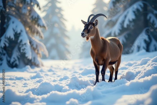 A lone brown goat amidst towering snowdrifts, wintry woods , forest, snowy