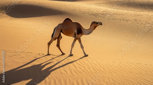 A lone camel walking across the desert, casting a long shadow on the sunlit sand dunes