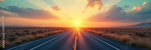 A lone car drives down a long, empty highway disappearing into the horizon, signifying the open road and journey of life , destination, exploration