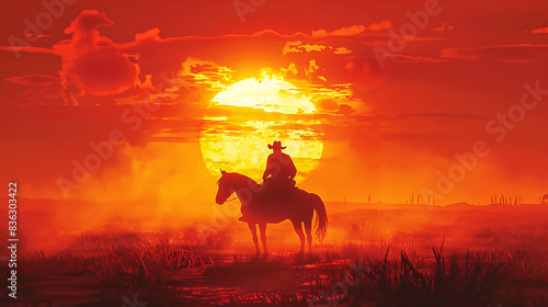 A lone cowboy, silhouetted against the blazing sunset in the vast expanse of the desert, his trusty horse by his side.