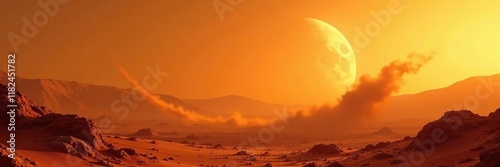A lone dust devil twirls in the Martian sunset, orange glow, mars landscape, dust devil