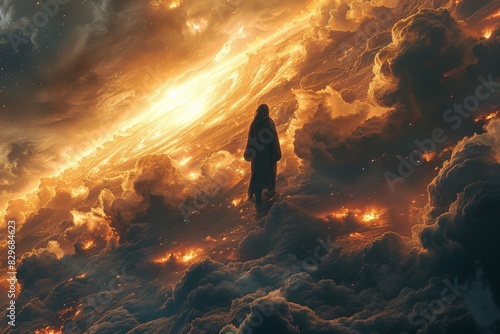 cloud, dramatic, figure, fantasy, artwork, digital artwork, mystery, solemn, spectacle, impressive, majestic, scenery, futuristic, nature, introspection, solitude, wonder, contemplation, inspirational, astronomy, vision, fate, aethereal, serene, escape, dark, glow, peaceful, observation, stratosphere, mystical, expansive, emotional, sky, phenomena, unique