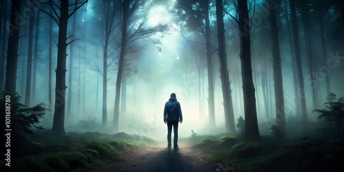 A lone figure walks through a misty forest with a bright light at the end of the path, Digital art, Foggy forest path, Man walking into the light, forest, fog, mystery