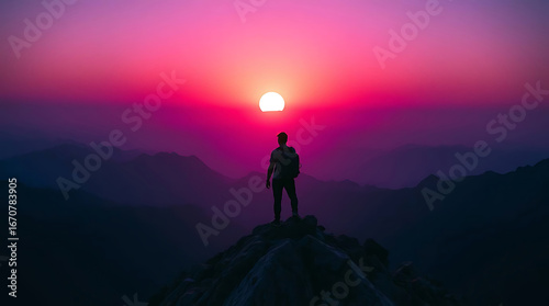 A lone man stands atop a mountain peak, silhouetted against a vibrant sunset, embodying adventure, freedom, and the pursuit of dreams in the heart of natures grandeur