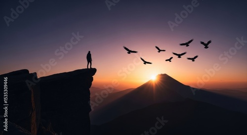 man, silhouette, cliff, mountain, sunset, sunrise, bird, flying, sky, horizon, nature, landscape, adventure, freedom, challenge, journey, hope, future, huge, dramatic, scenic, travel, exploration, peak, summit, achievement, goal, aspiration, solitude, alone, contemplation, view, majestic, inspiring, dawn, dusk, sun, light, glow, tranquil, success, courage, determination, orange, purple, flock, sunburst, spiritual